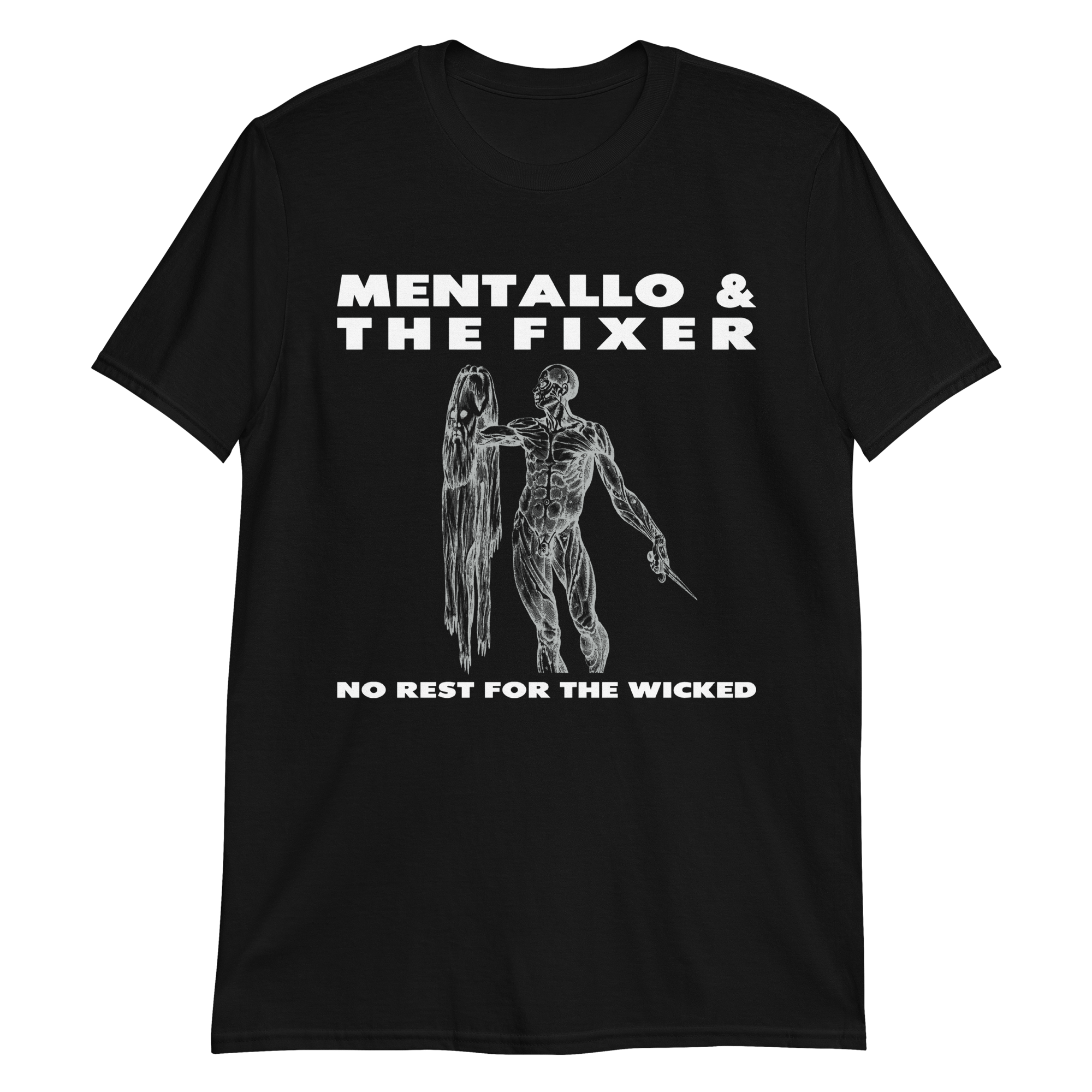 Mentallo & The Fixer 'No Rest For The Wicked 2025' t-shirt screen printed. Limited edition Resurrection Tour 2025 merch.
